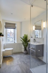freestanding shower, bathroom, renovation, interior design, Richmond interior designer, panelling, light fixtures, blinds