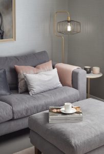 Interior, residential, interior design, Richmond interior designer, sofa, dusky pink, bespoke lamp, grey, gold tones, design